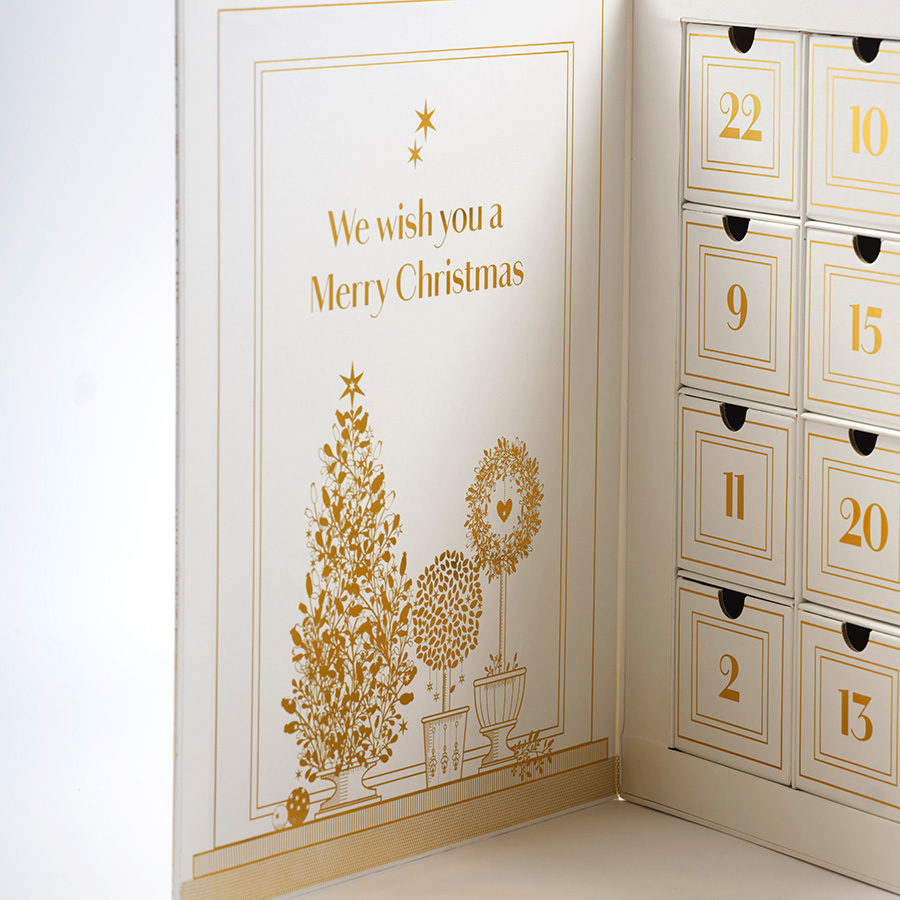 De gyldne detaljene reflekterer lyset og gir kalenderen et eksklusivt og tidløst preg som fremhever den spesielle julestemningen.